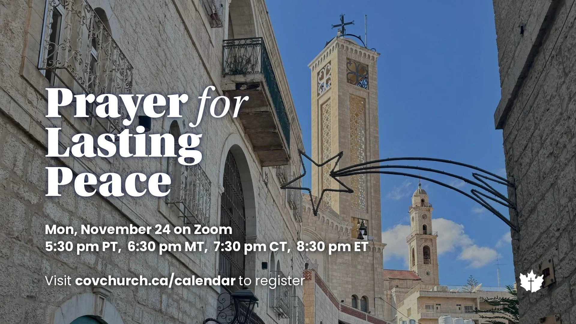 Prayer remains our primary response, asking once again for God’s will to be done on earth as it is in heaven. With that in mind, I invite you to join us for a Prayer for Lasting Peace on Monday evening, November 24, at 5:30 pm PT / 6:30 pm MT / 7:30 pm CT / 8:30 pm ET. RSVP to receive the Zoom link by visiting: www.covchurch.ca/calendar/prayer4peace