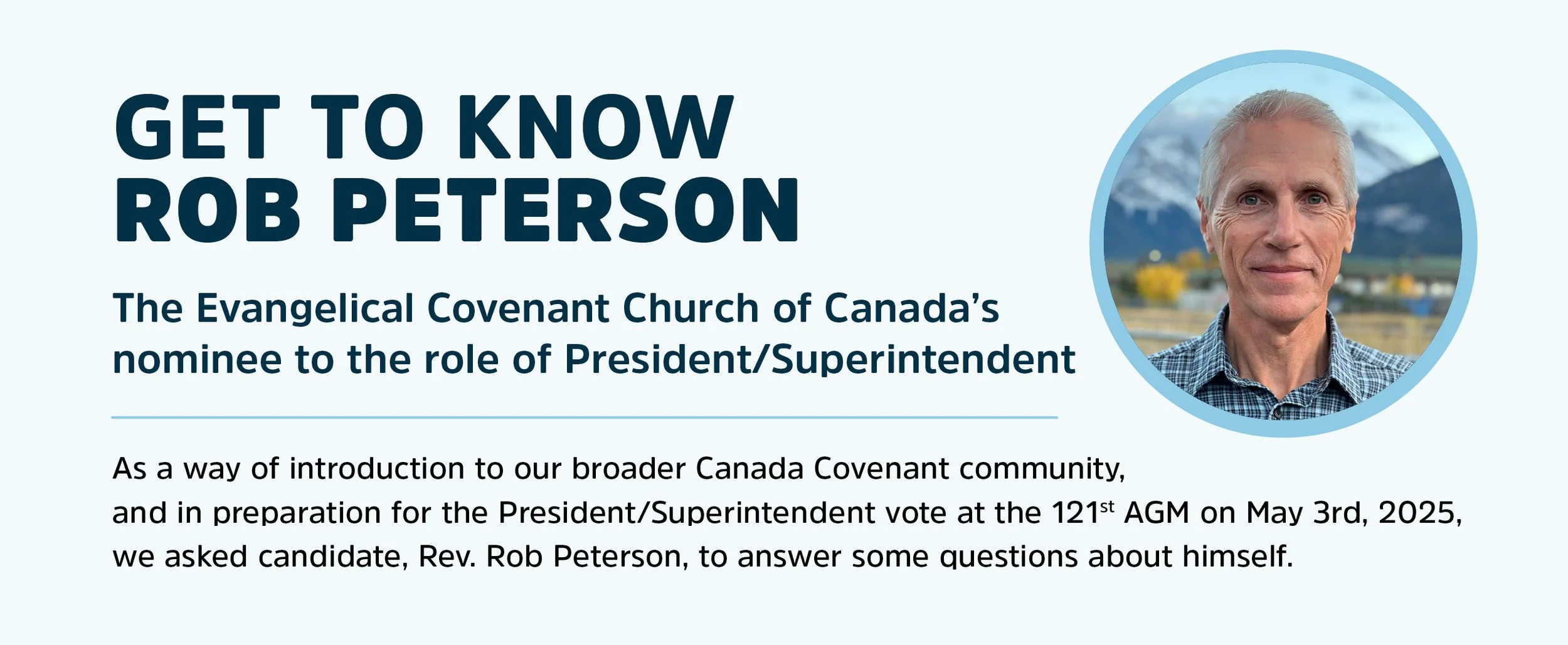 As a way of introduction to our broader Canada Covenant community, and in preparation for the President/Superintendent vote at the 121st AGM on May 3rd, 2025, we asked candidate, Rev. Rob Peterson, to answer some questions about himself.